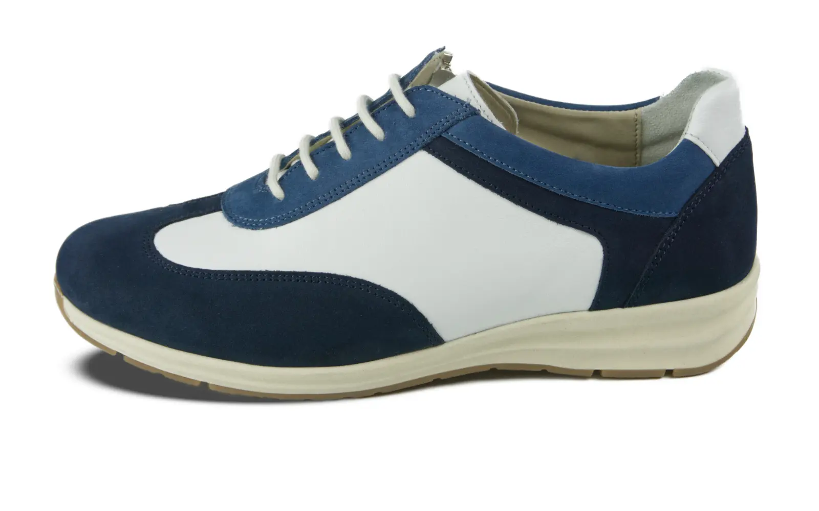 Top angesagtes Schnür-Modell MONIKA in der sportlichen Farbkombination blau/weiß. Das verwendete LammNappa-Leder ist geschmeidig weich und hier vollkommen nahtfrei über den gesamten Vorfußbereich gearbeitet. Das ungewöhnlich leichte Modell gibt perfekten Halt und stabilen Stand. Erleben Sie das großzügige Innenvolumen und die breite Auftrittsfläche dieses Schuhs. Gefüttert mit echtem Kalbleder, natürlich, atmungsaktiv und fußgesund. Die flexible PU-Laufsohle unterstützt den Abrollvorgang des Fußes, das Gehen ist unbeschwert und frei. Bester Tragekomfort Dank des bequemen Wechselfußbettes, das Sie bei Bedarf gegen Ihre persönlichen Einlagen austauschen können.